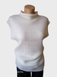 Vesta bez rukávu je pletená hladce, je rovného, volného střihu. U krku má malý stojáček s ruličkou.
