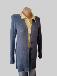 Rozpínací delší svetřík je pletený žebrovým vzorem, výstřih je do "V", zapínaný na 4 větší knoflíky. Lehce obepíná postavu.