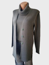 Vesta bez rukávu je pletena žebrovým vzorem, výstřih je do "V", zapínaný na 3 knoflíky. Lehce obepíná postavu.