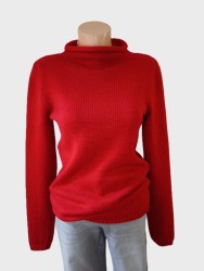 Pulover je pletený hladce, je rovného, volného střihu. s klasickými rukávy. U krku má malý stojáček s ruličkou.