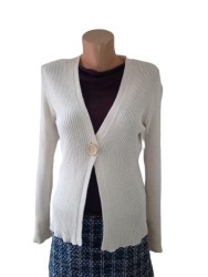 Svetřík je pletený žebrovým vzorem, výstřih je do "V". Lehce obepíná postavu. Je zapínaný na 1 větší knoflík.